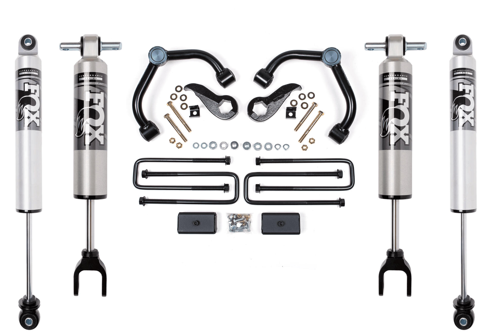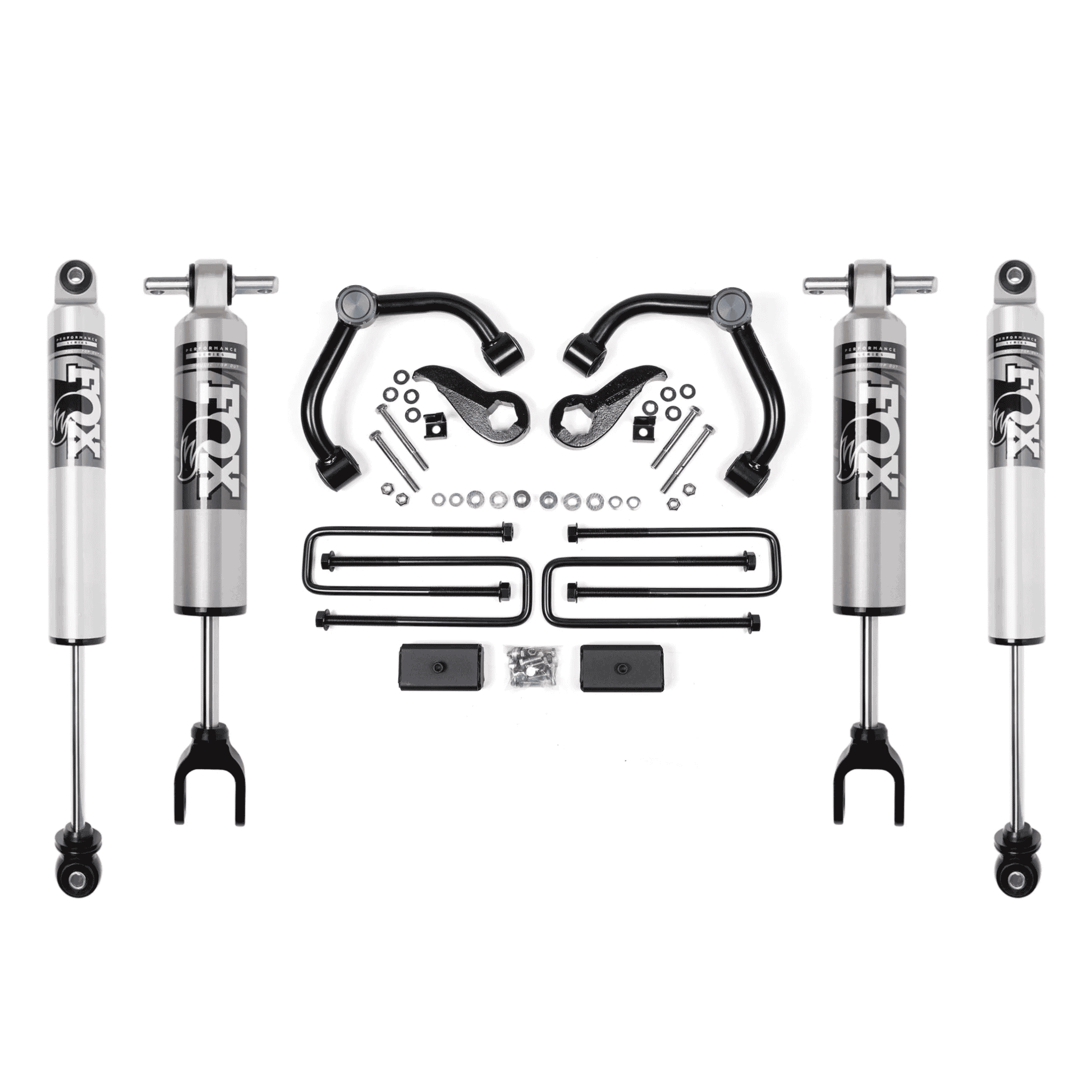 In the rear, a 2" block and u-bolt kit is used to create a level to slightly tail high stance when unloaded. Rounding out these kits are a pair of specially tuned FOX 2.0 performance series IFP shocks ready to soak up the terrain.