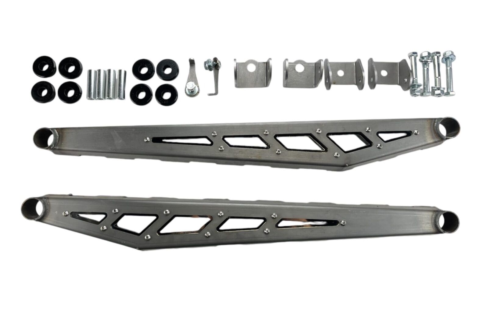 Kit Includes: (2) Boxed Style Compression Struts w/ Stainless Steel Inserts, (2) Brackets for Crossmember, (2) Brackets for Frame, (8) Bushings, (4) Insert Sleeves, & All Hardware
